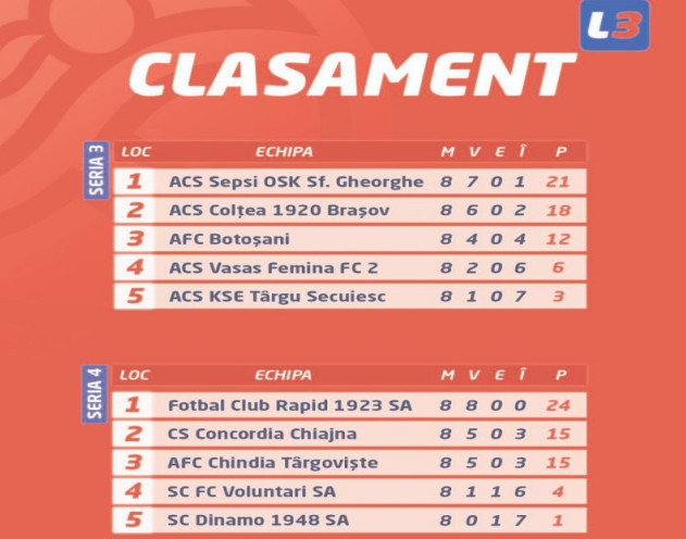 Cei 4 fruntași la final de an ai Ligii 3 Feminin sunt: AFC UTA Arad (seria 1), Universitatea Craiova (seria 2), ACS Sepsi OSK Sfântu Gheorghe (seria 3) și Fotbal Club Rapid 1923 (seria 4). Fiecare echipă a disputat câte 8 meciuri, obiectivul fiind promovarea în al doilea eșalon fotbalistic.