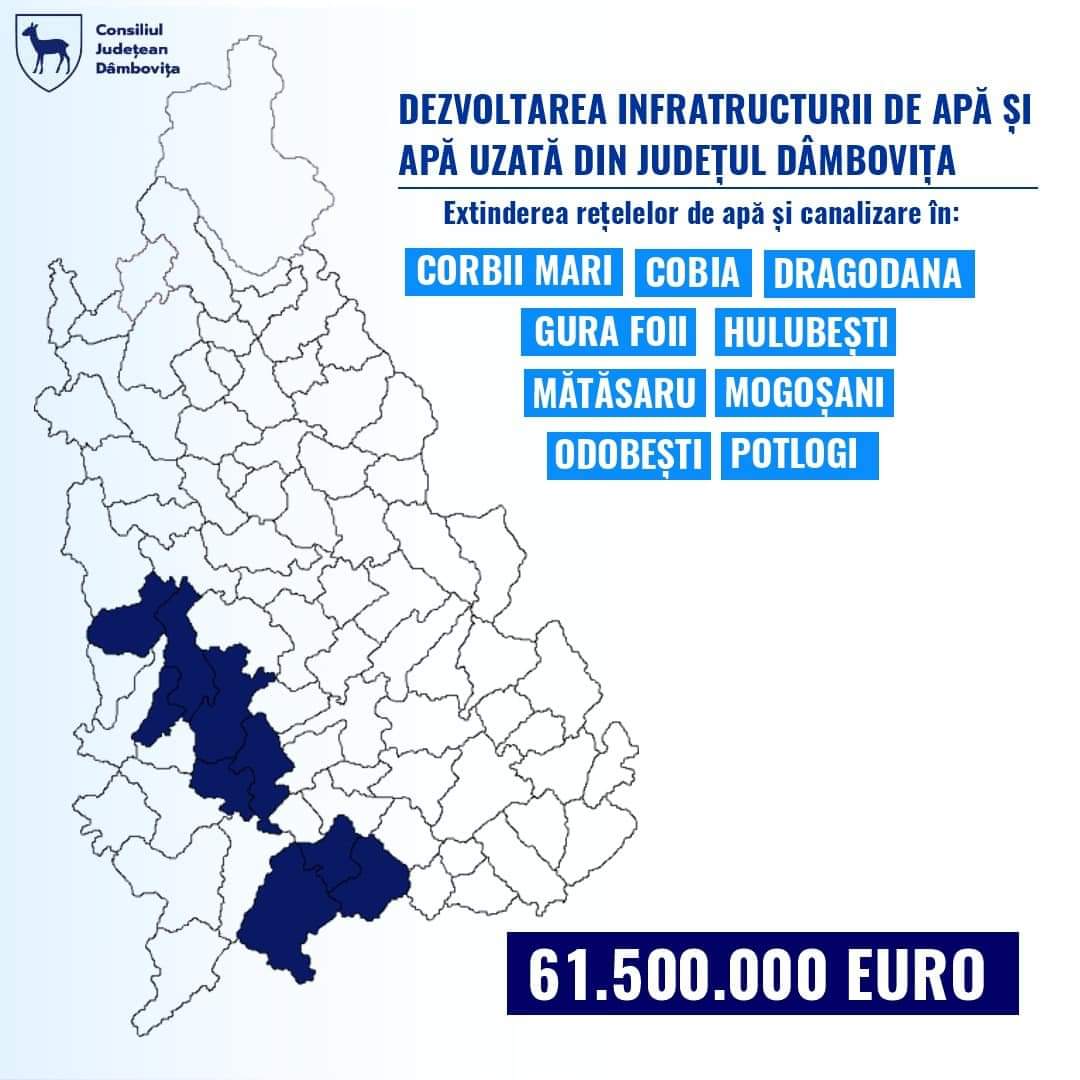 A fost desemnat câștigătorul licitației prin care se vor realiza și extinde rețele de apă și canalizare în comunele Hulubești, Potlogi, Odobești, Corbii Mari, Dragodana, Gura Foii, Cobia, Mogoșani și Mătăsaru.Valoarea lucrărilor pe acest lot, conform ofertei constructorului, se ridică la 61.500.000 de euro, TVA inclus