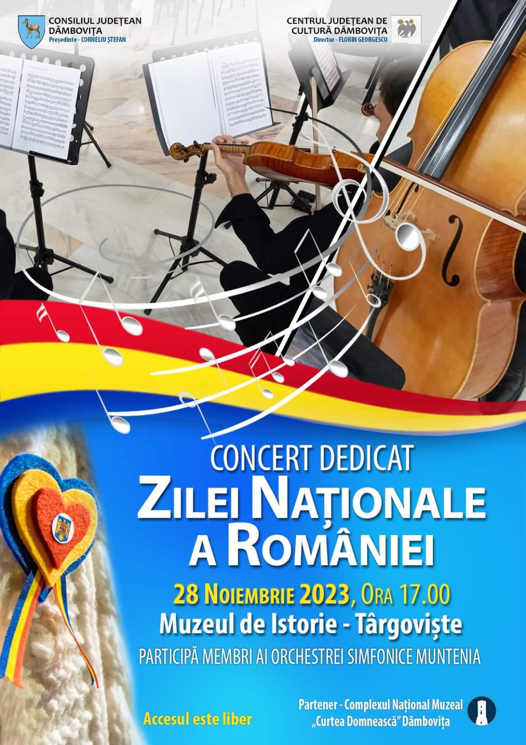 În semn de prețuire pentru importanța acestei zile și în cinstea țării pe care toți o numim ACASĂ, Centrul Județean de Cultură Dâmbovița organizează, pe data de 28 noiembrie, la Muzeul de Istorie, începând cu ora 17:00, un recital dedicat Zilei Naționale a României, susținut de membri ai Orchestrei Simfonice „Muntenia”.