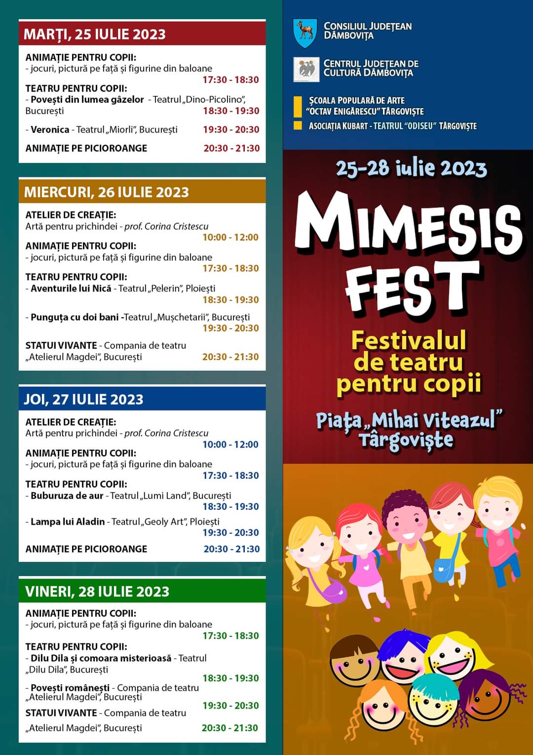 În perioada 25-28 iulie 2023, Centrul Judeţean de Cultură Dâmboviţa va organiza cea de-a VII-a ediţie a Festivalului de teatru pentru copii „Mimesis Fest”, ce are ca scop promovarea şi stimularea artei interpretative şi este, totodată, o alternativă de petrecere a vacanţei în aer liber.