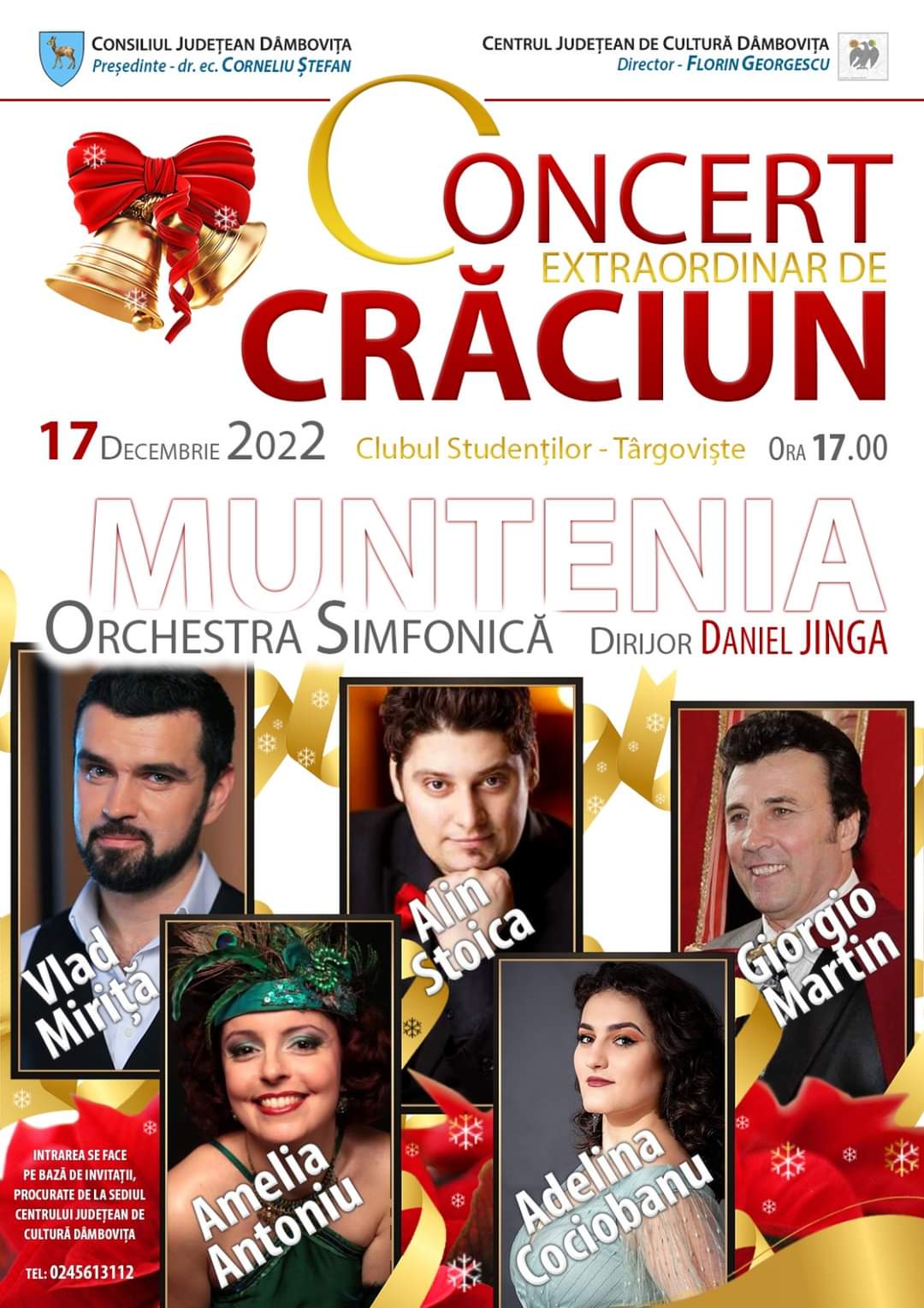 Așadar, pe data de 17 decembrie, începând cu ora 17:00, CJ Dâmbovița vă așteptă la Clubul Studenților pentru a vă bucura de magia Sărbătorilor de iarnă, alături de invitații speciali: tenorii Vlad Miriță, Alin Stoica, Giorgio Martin și sopranele Amelia Antoniu și Adelina Cociobanu.