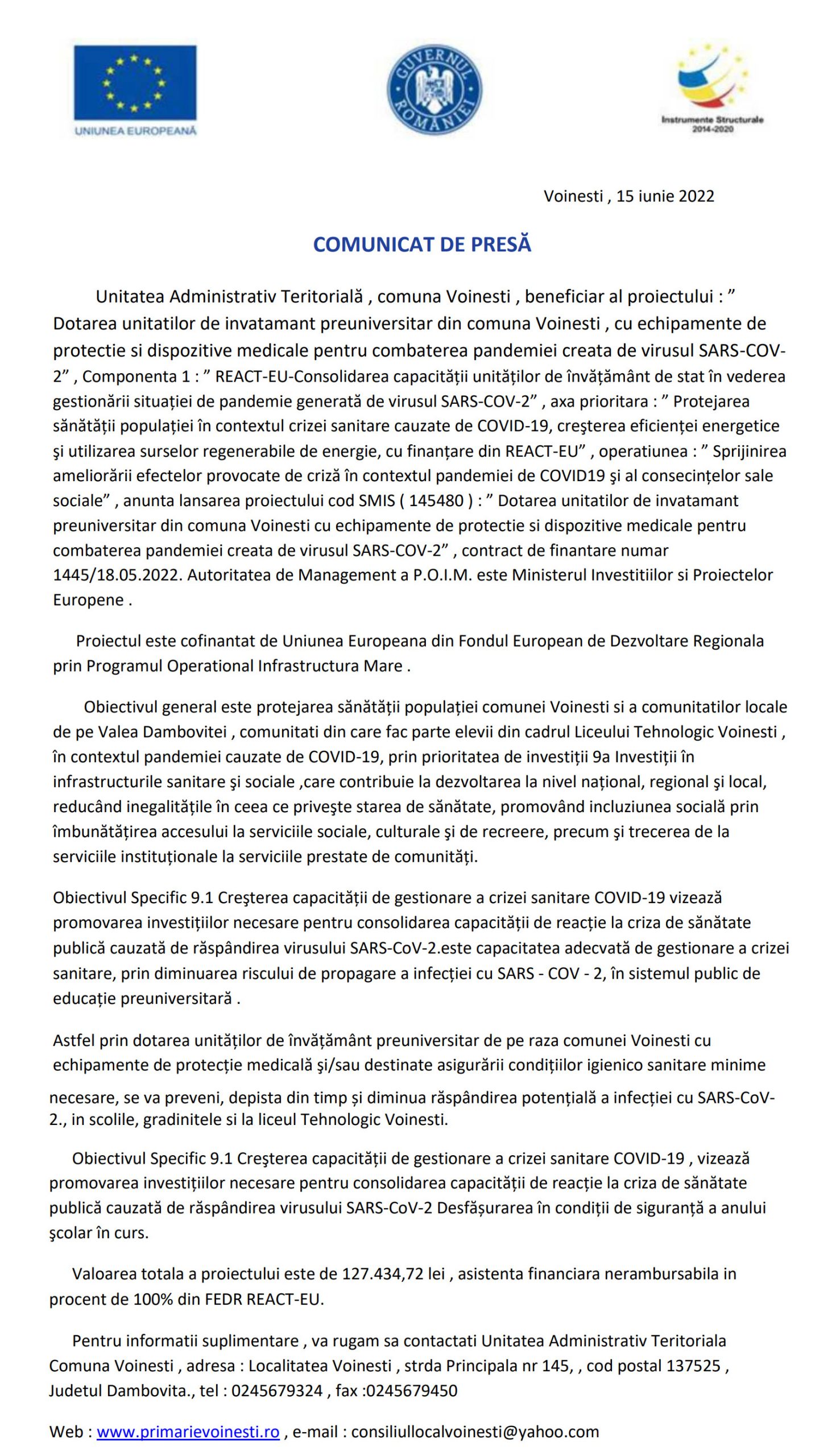 COMUNICAT DE PRESĂ By: Ziarul Dambovita Date: 15/06/2022 FacebookTwitterPinterestWhatsApp TagsCOMUNICAT DE PRESĂ Articolul precedentJandarmii dâmbovițeni sunt zilnic în stradă Articolul următorMinisterul Dezvoltării a aprobat toate cele 104 proiecte mature pentru distribuția gazelor, finanțate prin Programul ”Anghel Saligny” Ziarul Dambovita LĂSAȚI UN MESAJ Renunțați la răspuns Comentariu: Vă rugăm să introduceți comentariul dvs.! Nume:* Introduceți aici numele dvs. Email:* Ați introdus o adresă de e-mail incorectă! Vă rugăm să introduceți adresa dvs. de e-mail aici Website: Salvați numele meu, adresa de e-mail și site-ul web în acest browser pentru data viitoare i comentariu. Δ Acest site folosește Akismet pentru a reduce spamul. Află cum sunt procesate datele comentariilor tale. Popular Adrenalină și suspans la Cinema Independența din Târgoviște: „Anaconda” ajunge pe marele ecran A apărut Almanahul bisericesc 2026 al Arhiepiscopiei Târgoviștei – o oglindă a vieții pastorale și academice contemporane CJ Dâmbovița încheie o nouă ediție a programului de internship Avertisment pentru turiști: Recomandările jandarmilor montani înainte de urcarea în Bucegi Restricții de circulație în Ungaria, pe Drumul Principal 42 punct frontieră Artand-Borș, începând cu 1 ianuarie 2026! ȘtiriDâmbovița Județul Dâmbovița, sub asediul gerului – temperaturi de până la -11 grade Celsius Roxana - Ionela Botea - 02/01/2026 Dimineață geroasă – 2 ianuarie , temperaturi minime înregistrate... Vești bune pentru fermieri: începe depunerea cererilor pentru bunăstarea animalelor (DR-06) Roxana - Ionela Botea - 02/01/2026 Fermierii din sectorul zootehnic au motive de optimism la... Mani Gyenes, din nou la startul Raliului Dakar: România are reprezentant în cursa supremă a anduranței Roxana - Ionela Botea - 02/01/2026 România va fi din nou reprezentată la cel mai... Noi taxe și impozite în vigoare de la 1 ianuarie 2026 Roxana - Ionela Botea - 02/01/2026 Începând cu 1 ianuarie 2026, în România au intrat...