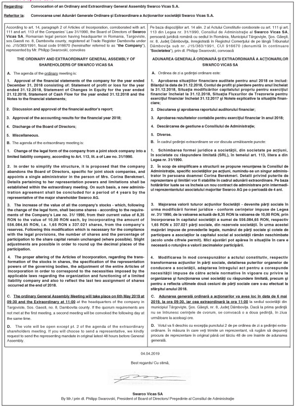 Convocarea unei Adunări Generale Ordinare şi Extraordinare a Acţionarilor societăţii Swarco Vicas S.A.