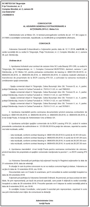 CONVOCATOR AL ADUNĂRII GENERALE EXTRAORDINARE A ACŢIONARILOR S.C. Metex S.A. By: Ziarul Dambovita Date: 10/10/2018 FacebookTwitterPinterestWhatsApp CONVOCATOR AL ADUNĂRII GENERALE EXTRAORDINARE A ACŢIONARILOR S.C. Metex S.A. TagsCONVOCATOR AL ADUNĂRII GENERALE EXTRAORDINARE A ACŢIONARILOR S.C. Metex S.A. Articolul precedentFLORIN TĂNASE, SINGURUL DÂMBOVIŢEAN CONVOCAT LA EHIPA MARE A ROMÂNIEIArticolul următorINFORMARE Ziarul Dambovita LĂSAȚI UN MESAJ Renunțați la răspuns Comentariu: Vă rugăm să introduceți comentariul dvs.! Nume:* Introduceți aici numele dvs. Email:* Ați introdus o adresă de e-mail incorectă! Vă rugăm să introduceți adresa dvs. de e-mail aici Website: Salvați numele meu, adresa de e-mail și site-ul web în acest browser pentru data viitoare i comentariu. Δ Acest site folosește Akismet pentru a reduce spamul. Află cum sunt procesate datele comentariilor tale. Popular Adrenalină și suspans la Cinema Independența din Târgoviște: „Anaconda” ajunge pe marele ecran A apărut Almanahul bisericesc 2026 al Arhiepiscopiei Târgoviștei – o oglindă a vieții pastorale și academice contemporane CJ Dâmbovița încheie o nouă ediție a programului de internship Avertisment pentru turiști: Recomandările jandarmilor montani înainte de urcarea în Bucegi Restricții de circulație în Ungaria, pe Drumul Principal 42 punct frontieră Artand-Borș, începând cu 1 ianuarie 2026! ȘtiriDâmbovița Județul Dâmbovița, sub asediul gerului – temperaturi de până la -11 grade Celsius Roxana - Ionela Botea - 02/01/2026 Dimineață geroasă – 2 ianuarie , temperaturi minime înregistrate... Vești bune pentru fermieri: începe depunerea cererilor pentru bunăstarea animalelor (DR-06) Roxana - Ionela Botea - 02/01/2026 Fermierii din sectorul zootehnic au motive de optimism la... Mani Gyenes, din nou la startul Raliului Dakar: România are reprezentant în cursa supremă a anduranței Roxana - Ionela Botea - 02/01/2026 România va fi din nou reprezentată la cel mai... Noi taxe și impozite în vigoare de la 1 ianuarie 2026 Roxana - Ionela Botea - 02/01/2026 Începând cu 1 ianuarie 2026, în România au intrat...