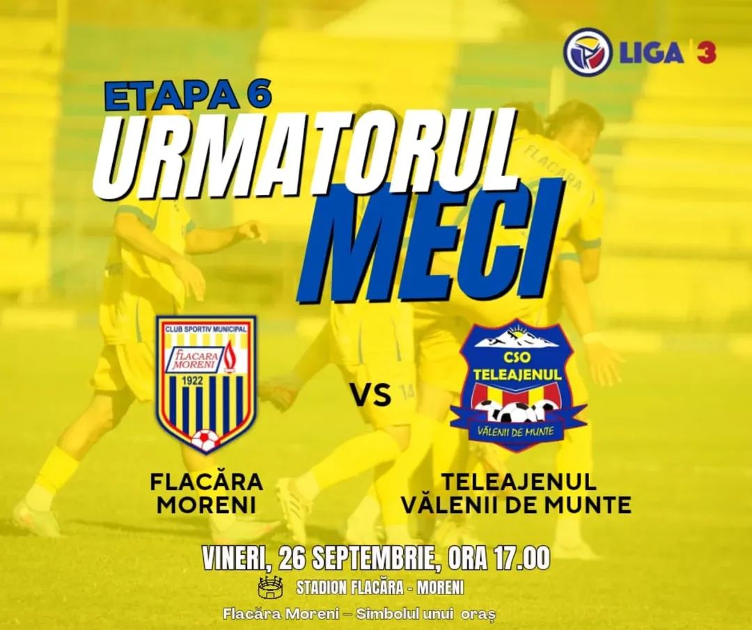 CSM Flacăra Moreni revine pe terenul propriu pentru un meci important în Liga 3, Seria 4 – Etapa 6, împotriva echipei CSO Teleajenul Vălenii de Munte.Vineri, 26 septembrie 2025, ora 17:00, Stadion Flacăra, Moreni