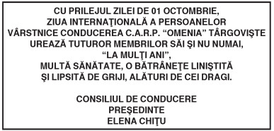 CU PRILEJUL ZILEI DE 01 OCTOMBRIE, ZIUA INTERNAŢIONALĂ A PERSOANELOR VÂRSTNICE CONDUCEREA C.A.R.P. „OMENIA” TÂRGOVIŞTE UREAZĂ TUTUROR MEMBRILOR SĂI ŞI NU NUMAI,