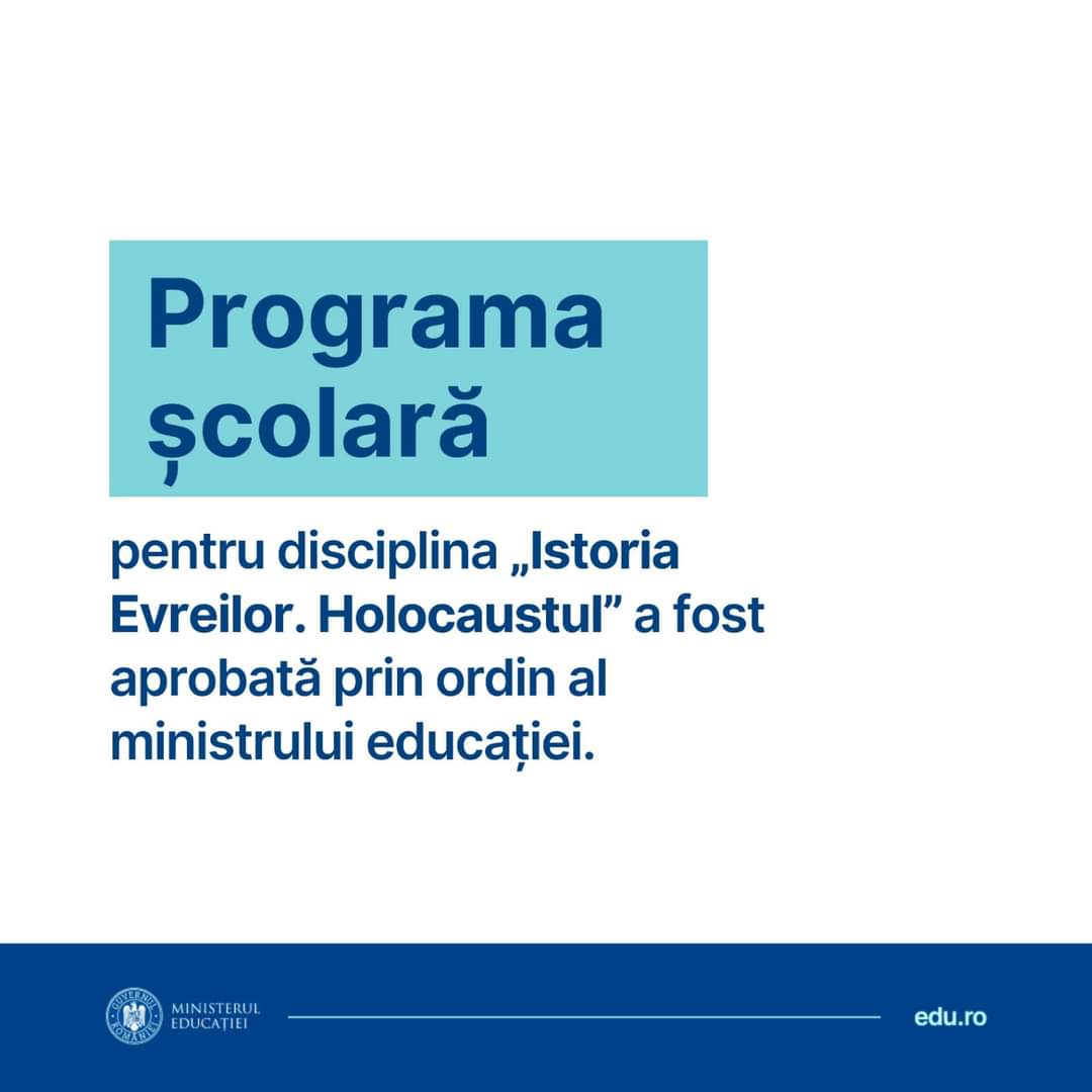 A fost semnat ordinul privind aprobarea programei școlare pentru disciplina de studiu obligatorie „Istoria Evreilor. Holocaustul”, pentru punerea în aplicare a Legii nr. 276/2021, în anul școlar trecut au fost modificate planurile-cadru și disciplina „Istoria Evreilor. Holocaustul” a fost introdusă între disciplinele obligatorii.