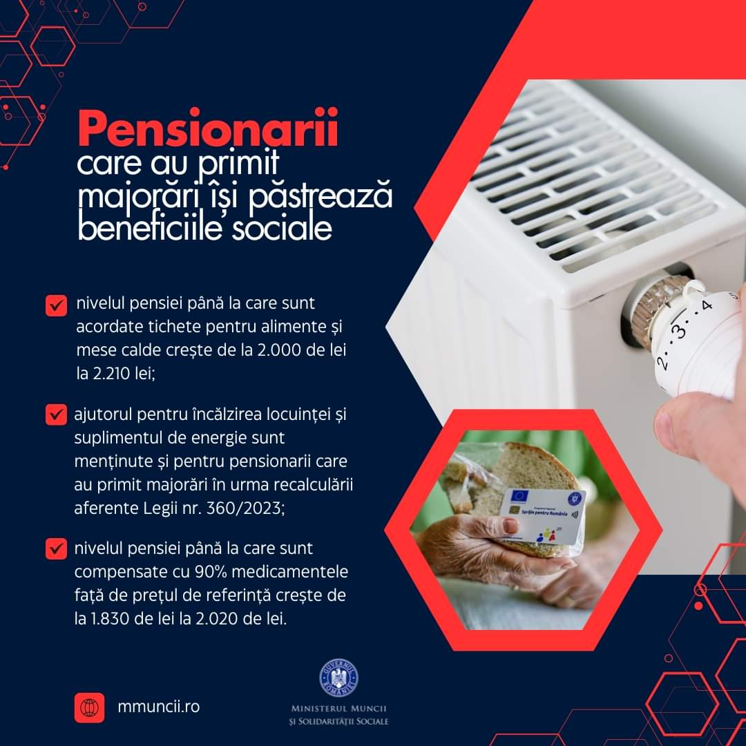 ”Această măsura are în vedere sprijinirea pensionarilor care prin recalcularea dreptului de pensie ar fi ieșit de sub incidenta aplicării prevederilor Legii nr. 226/2021 privind stabilirea măsurilor de protecţie socială pentru consumatorul vulnerabil de energie. Aceste categorii de persoane sunt într-o situație de vulnerabilitate, iar acest sprijin material este esențial pentru asigurarea unui trai decent”, a declarat ministrul Muncii și Solidarității Sociale, Simona Bucura Oprescu.