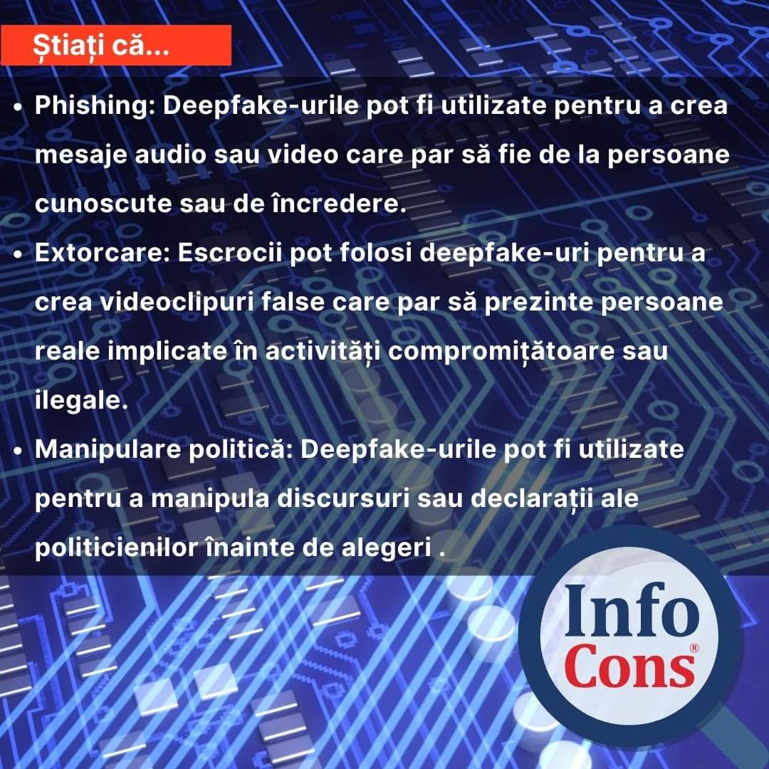 2. Phishing: Deepfake-urile pot fi utilizate pentru a crea mesaje audio sau video care par să fie de la persoane cunoscute sau de încredere, cerând informații personale sau credențiale de acces. Prin manipularea conținutului multimedia, escrocii pot încerca să obțină acces la conturile online sau să fure date personale sensibile.