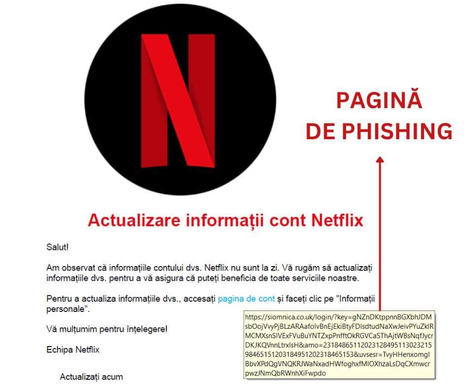 Instituțiile atrag atenția cetățenilor sa dea dovadă  de PRECAUȚIE cand primesc e-mail sau SMS-uri, în spatele lor pot sta infractorii cibernetici , ai primit un e-mail, sau poate chiar un SMS de la Netflix, prin care ești notificat că trebuie să-ți actualizezi informațiile de client’? Ai grijă! În spatele inițiativei sunt infractori cibernetici care vor să-ți fure datele de autentificare.