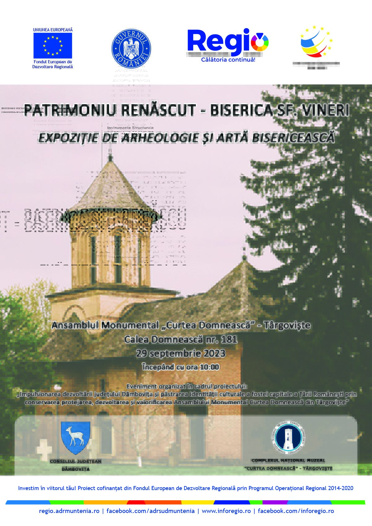 Consiliul Județean Dâmbovița, prin Complexul Național Muzeal „Curtea Domnească” Târgoviște vă invită vineri, 29 septembrie 2023, ora 10:00, la deschiderea expoziției de arheologie și artă bisericească „Patrimoniu renăscut – Biserica Sf. Vineri”, ce va fi organizată în incinta Ansamblului Monumental „Curtea Domnească” Târgoviște.