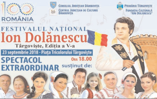 Consiliul Judeţean Dâmboviţa, Primăria Municipiului Târgovişte, Centrul Judeţean de Cultură Dâmboviţa şi Fundaţia Culturală „Ion Dolănescu” sunt organizatorii unui eveniment de înaltă ţinută. Este vorba despre cea de-a V-a ediţie a Festivalului Naţional „Ion Dolănescu” ce se va desfăşura, în anul 2018, la data de 23 septembrie, începând cu orele 18:00 în Piaţa Tricolorului din Târgovişte.