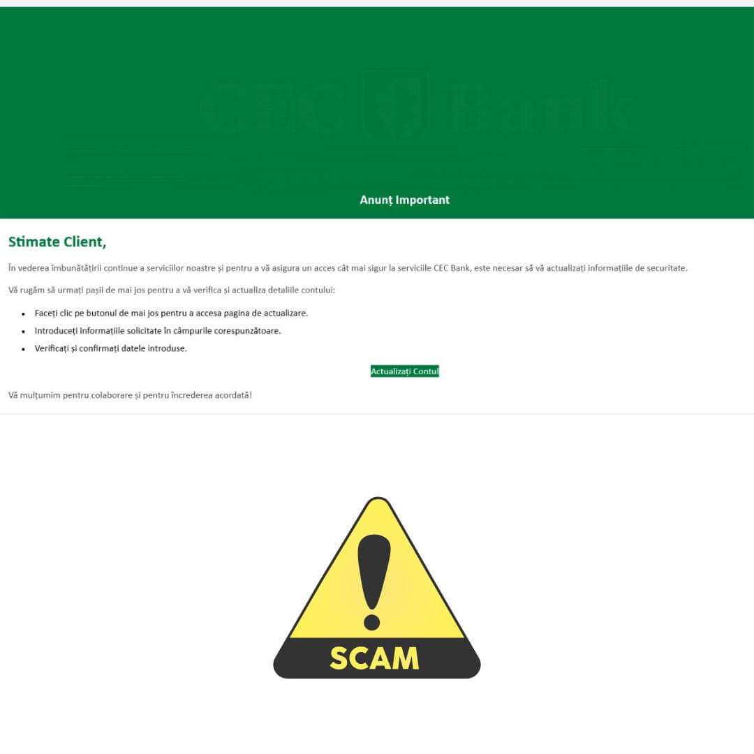 Atacatorii din online continuă campaniile de phishing prin uzurparea identității instituțiilor și companiilor legitime din România. Astăzi, vă punem în atenție o nouă astfel de fraudă care se folosește de identitatea CEC BANK.