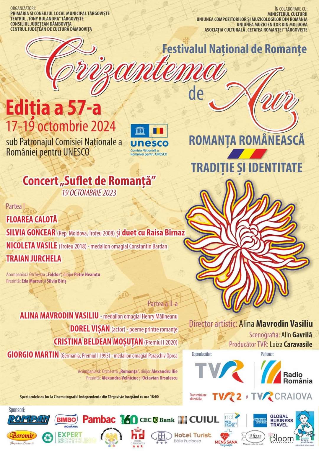 Târgoviște va găzdui în perioada 17-19 octombrie 2024, Festivalul Național de Interpretare și Creație a Romanței „Crizantema de Aur”, un eveniment de referință dedicat artei romanței românești.Ediția din acest an, cu tema „ROMANȚA ROMÂNEASCĂ – TRADIȚIE ȘI IDENTITATE”, își propune să celebreze tradițiile și valorile identitare românești, punând în lumină bogăția și diversitatea acestui gen muzical.