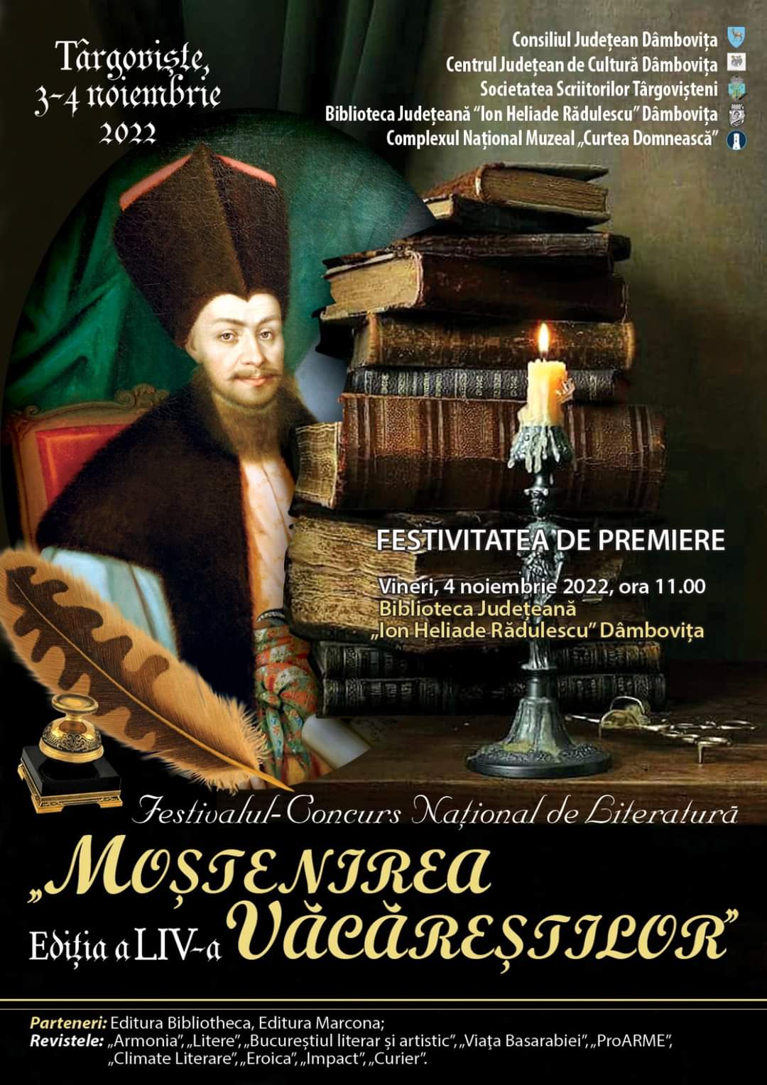 Consiliul Judeţean Dâmboviţa, prin Centrul Judeţean de Cultură Dâmboviţa, împreună cu Societatea Scriitorilor Târgovişteni, Biblioteca Judeţeană „I. H. Rădulescu”, Complexul Național Muzeal „Curtea Domnească” şi cu sprijinul Uniunii Scriitorilor din România, desfăşoară în perioada 3 – 4 noiembrie 2022, a LIV – a ediţie a Festivalului-Concurs Naţional de Literatură „Moştenirea Văcăreştilor”.