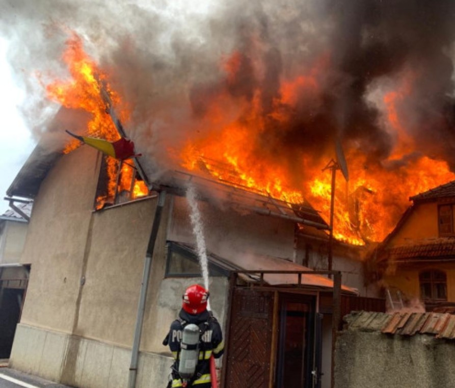 La fața locului, incendiul se manifesta la acoperișul unei case și la o anexă, pe o suprafață de aproximativ 100 mp.