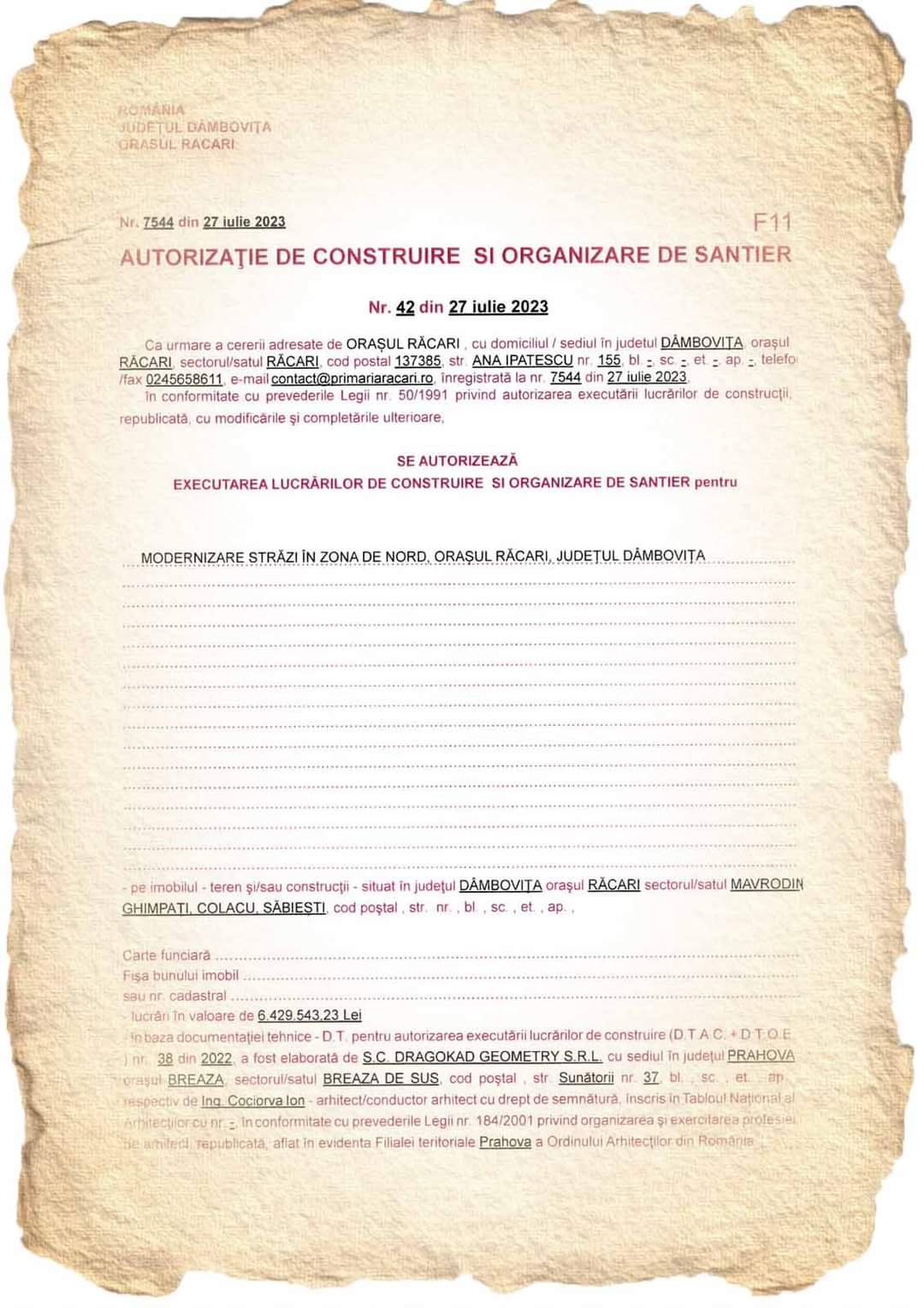 Administrația locală de la Răcari a anunțat că a fost emisă autorizația de construire și organizare șantier pentru pentru obiectivul: “Modernizare străzi în zona NORD, orașul Răcari, județul Dâmbovița ’’,