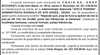 INFORMARE By: Ziarul Dambovita Date: 22/02/2019 FacebookTwitterPinterestWhatsApp INFORMARE TagsINFORMARE Articolul precedentANUNŢ PUBLIC 2Articolul următorRECRUTARE PENTRU PROFESIA MILITARĂ Ziarul Dambovita LĂSAȚI UN MESAJ Renunțați la răspuns Comentariu: Vă rugăm să introduceți comentariul dvs.! Nume:* Introduceți aici numele dvs. Email:* Ați introdus o adresă de e-mail incorectă! Vă rugăm să introduceți adresa dvs. de e-mail aici Website: Salvați numele meu, adresa de e-mail și site-ul web în acest browser pentru data viitoare i comentariu. Δ Acest site folosește Akismet pentru a reduce spamul. Află cum sunt procesate datele comentariilor tale. Popular Adrenalină și suspans la Cinema Independența din Târgoviște: „Anaconda” ajunge pe marele ecran A apărut Almanahul bisericesc 2026 al Arhiepiscopiei Târgoviștei – o oglindă a vieții pastorale și academice contemporane CJ Dâmbovița încheie o nouă ediție a programului de internship Avertisment pentru turiști: Recomandările jandarmilor montani înainte de urcarea în Bucegi Restricții de circulație în Ungaria, pe Drumul Principal 42 punct frontieră Artand-Borș, începând cu 1 ianuarie 2026! ȘtiriDâmbovița Județul Dâmbovița, sub asediul gerului – temperaturi de până la -11 grade Celsius Roxana - Ionela Botea - 02/01/2026 Dimineață geroasă – 2 ianuarie , temperaturi minime înregistrate... Vești bune pentru fermieri: începe depunerea cererilor pentru bunăstarea animalelor (DR-06) Roxana - Ionela Botea - 02/01/2026 Fermierii din sectorul zootehnic au motive de optimism la... Mani Gyenes, din nou la startul Raliului Dakar: România are reprezentant în cursa supremă a anduranței Roxana - Ionela Botea - 02/01/2026 România va fi din nou reprezentată la cel mai... Noi taxe și impozite în vigoare de la 1 ianuarie 2026 Roxana - Ionela Botea - 02/01/2026 Începând cu 1 ianuarie 2026, în România au intrat...