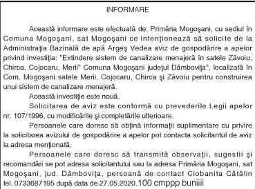 Această informare este efectuată de: Primăria Mogoşani, cu sediul în Comuna Mogoşani, sat Mogoşani ce intenţionează să solicite de la Administraţia Bazinală de apă Argeş Vedea aviz de gospodărire a apelor privind investiţia: „Extindere sistem de canalizare menajeră în satele Zăvoiu, Chirca, Cojocaru, Merii” Comuna Mogoşani judeţul Dâmboviţa”, localizată în Com. Mogoşani satele Merii, Cojocaru, Chirca şi Zăvoiu pentru construirea unui sistem de canalizare menajeră.