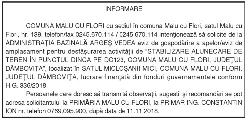 INFORMARE By: Ziarul Dambovita Date: 14/11/2018 FacebookTwitterPinterestWhatsApp INFORMARE TagsINFORMARE Articolul precedentANUNŢ PUBLICArticolul următorANUNŢ PUBLIC Ziarul Dambovita LĂSAȚI UN MESAJ Renunțați la răspuns Comentariu: Vă rugăm să introduceți comentariul dvs.! Nume:* Introduceți aici numele dvs. Email:* Ați introdus o adresă de e-mail incorectă! Vă rugăm să introduceți adresa dvs. de e-mail aici Website: Salvați numele meu, adresa de e-mail și site-ul web în acest browser pentru data viitoare i comentariu. Δ Acest site folosește Akismet pentru a reduce spamul. Află cum sunt procesate datele comentariilor tale. Popular Adrenalină și suspans la Cinema Independența din Târgoviște: „Anaconda” ajunge pe marele ecran A apărut Almanahul bisericesc 2026 al Arhiepiscopiei Târgoviștei – o oglindă a vieții pastorale și academice contemporane CJ Dâmbovița încheie o nouă ediție a programului de internship Avertisment pentru turiști: Recomandările jandarmilor montani înainte de urcarea în Bucegi Restricții de circulație în Ungaria, pe Drumul Principal 42 punct frontieră Artand-Borș, începând cu 1 ianuarie 2026! ȘtiriDâmbovița Județul Dâmbovița, sub asediul gerului – temperaturi de până la -11 grade Celsius Roxana - Ionela Botea - 02/01/2026 Dimineață geroasă – 2 ianuarie , temperaturi minime înregistrate... Vești bune pentru fermieri: începe depunerea cererilor pentru bunăstarea animalelor (DR-06) Roxana - Ionela Botea - 02/01/2026 Fermierii din sectorul zootehnic au motive de optimism la... Mani Gyenes, din nou la startul Raliului Dakar: România are reprezentant în cursa supremă a anduranței Roxana - Ionela Botea - 02/01/2026 România va fi din nou reprezentată la cel mai... Noi taxe și impozite în vigoare de la 1 ianuarie 2026 Roxana - Ionela Botea - 02/01/2026 Începând cu 1 ianuarie 2026, în România au intrat...