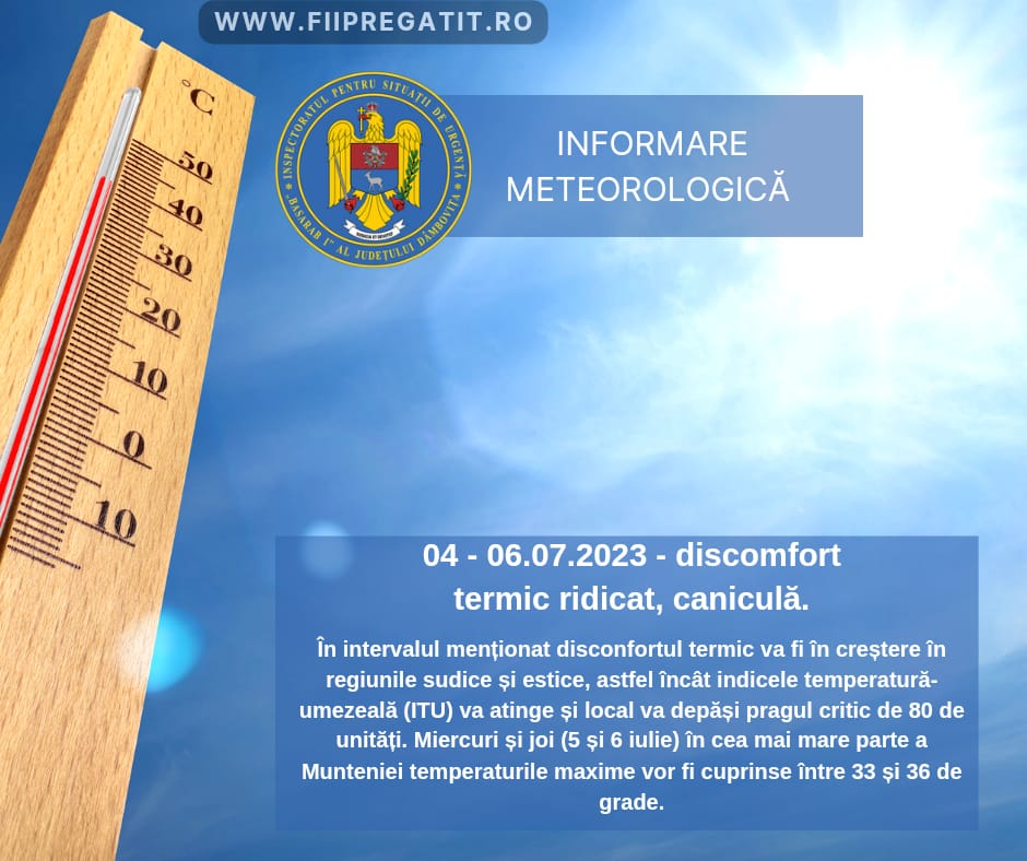 Disconfortul termic va fi în creștere în regiunile sudice și estice, astfel încât indicele temperatură-umezeală (ITU) va atinge și local va depăși pragul critic de 80 de unități. Miercuri și joi (5 și 6 iulie) în cea mai mare parte a Munteniei temperaturile maxime vor fi cuprinse între 33 și 36 de grade.