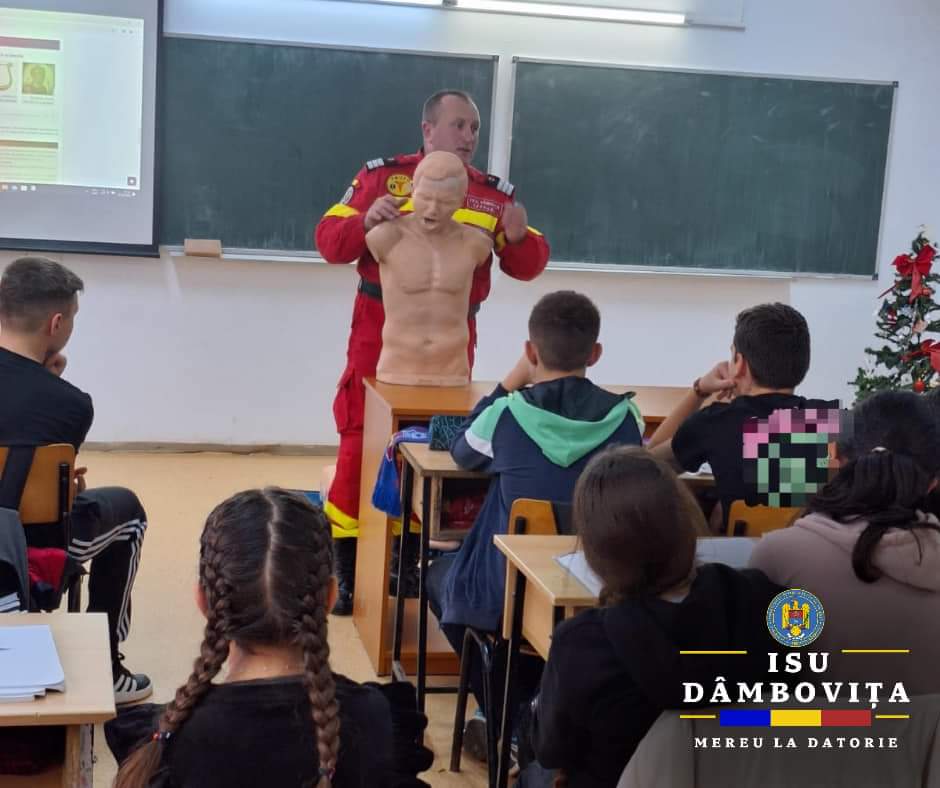 ISU Dâmbovița continuă activitățile de pregătire și instruire pentru acordarea primului ajutor,   în  unitățile școlare dâmbovițene, sub îndrumarea unui instructor de formare de la Centrul de Formare și Pregătire în Descarcerare și Asistență Medicală de Urgență, aparținând Inspectoratului pentru Situaţii de Urgenţă „Basarab I” al județului Dâmbovița.