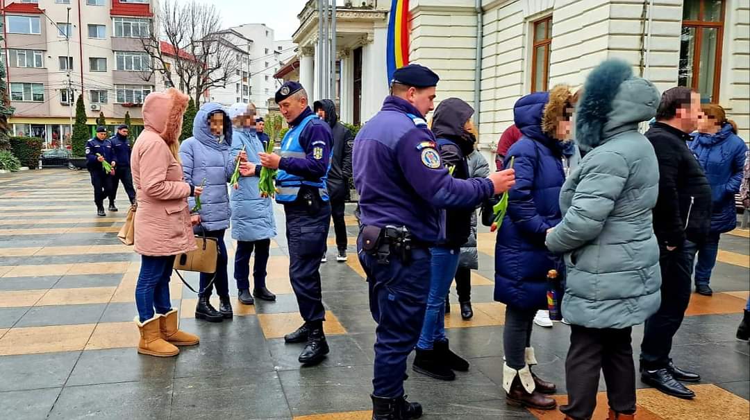 ” Cu zâmbetul pe buze, le-am oferit doamnelor prezente în Piața Revoluției din municipiul Târgovişte câte un simbol al primăverii, în semn de respect. ” a transmis Jandarmeria Dâmboviţa