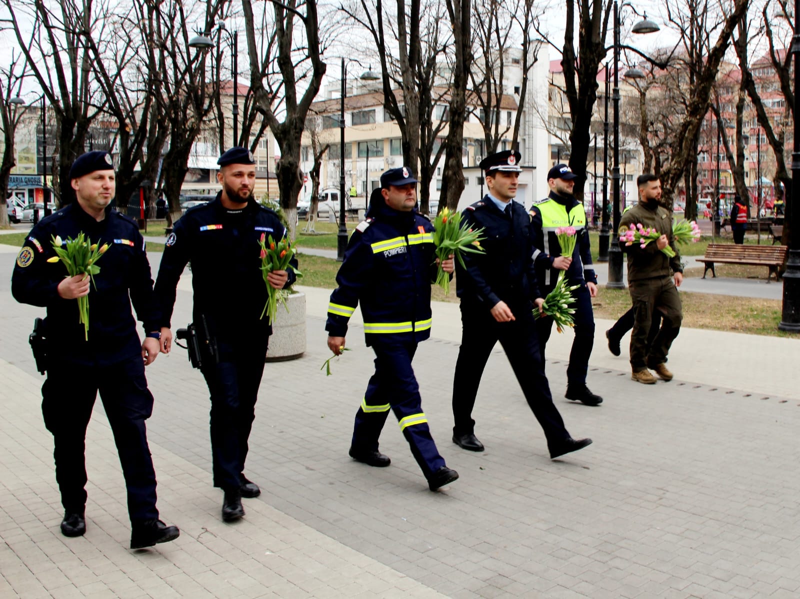 Jandarmii polițiștii și pompierii au oferit flori doamnelor și domnișoarelor