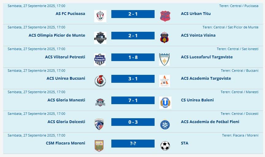 Rezultatele etapei la Juniori U15 au adus victorii importante pentru echipele gazdă și câteva surprize în deplasare. Formațiile din Pucioasa, Picior de Munte, Bucșani și Mănești s-au impus pe teren propriu, în timp ce Luceafărul Târgoviște și Fieni au reușit să câștige în deplasare.