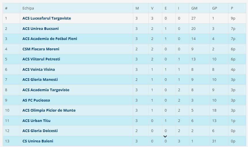 În partea opusă a clasamentului, Titu, Doicești și Băleni ocupă ultimele poziții.