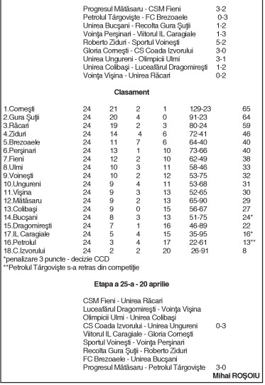 LIGA A IV A. ETAPA A 25 A. REZULTATE TEHNICE By: Mihai ROŞOIU Date: 18/04/2019 FacebookTwitterPinterestWhatsApp LIGA A IV A. ETAPA A 25 A. REZULTATE TEHNICE TagsLIGA A IV A. ETAPA A 25 A. REZULTATE TEHNICE Articolul precedentCHINDIA, AJUTOR NEAŞTEPTAT DE LA LPFArticolul următorSCHIMBĂRI DE ULTIMĂ ORĂ ÎN FOTBALUL ROMÂNESC Mihai ROŞOIU LĂSAȚI UN MESAJ Renunțați la răspuns Comentariu: Vă rugăm să introduceți comentariul dvs.! Nume:* Introduceți aici numele dvs. Email:* Ați introdus o adresă de e-mail incorectă! Vă rugăm să introduceți adresa dvs. de e-mail aici Website: Salvați numele meu, adresa de e-mail și site-ul web în acest browser pentru data viitoare i comentariu. Popular Transport ilegal de material lemnos, descoperit de polițiști în Braniștea Activitate educativ-duhovnicească dedicată Sfinților Trei Ierarhi, la Bucșani Eisberg, un reper privind securitatea alimentară a salatelor gata de consum Plafonarea adaosului la alimente, când inflaţia sare de 5% Atenție la bijuterii periculoase! Colierul cu pandantiv fluture vândut online, prezintă riscuri chimice serioase ȘtiriDâmbovița Atenție, nou val de fraude financiare online Roxana - Ionela Botea - 30/01/2026 Autoritățile atrag atenția asupra unei campanii de fraudă online... Transport ilegal de material lemnos, descoperit de polițiști în Braniștea Roxana - Ionela Botea - 30/01/2026 Polițiștii din cadrul Poliției Orașului Titu au identificat un... AJF Dâmbovița dă startul înscrierilor pentru un nou curs de formare arbitri Roxana - Ionela Botea - 30/01/2026 „Intră în joc!” Asociația Județeană de Fotbal Dâmbovița a anunțat... Chindia Târgoviște joacă acasă!Meci cu ARO Muscelul Câmpulung Muscel, intrare liberă pentru suporteri Roxana - Ionela Botea - 30/01/2026 Vești excelente pentru iubitorii fotbalului din Târgoviște! Chindia Târgoviște...