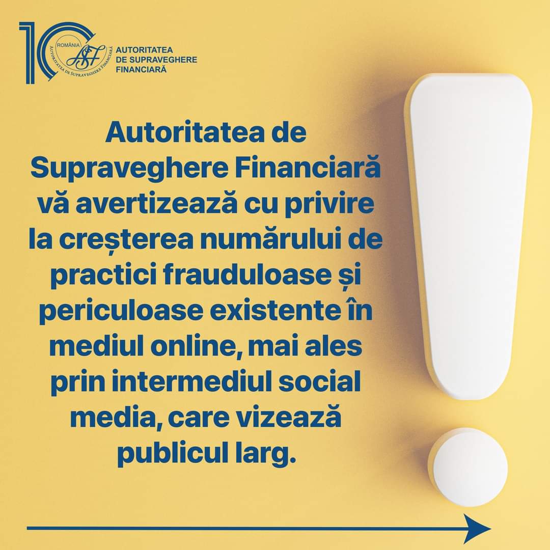 Autoritatea de Supraveghere Financiară atenționează cu privire la creșterea numărului de practici frauduloase și periculoase existente în mediul online, mai ales prin intermediul social media, care vizează publicul larg.