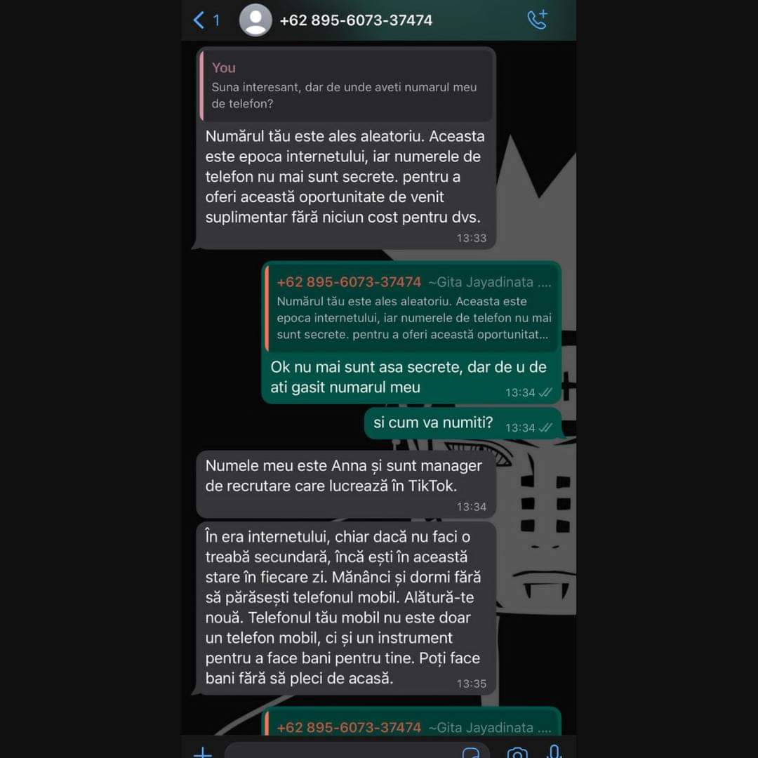 În spatele mesajelor nesolicitate se aflau de fapt infractori cibernetici, care încercau să îi convingă pe utilizatori să aprecieze anumite postări pe social media, de obicei fiind vorba despre cinci clipuri pe Youtube sau TikTok, cu scopul de a fi remunerați pentru acest serviciu.