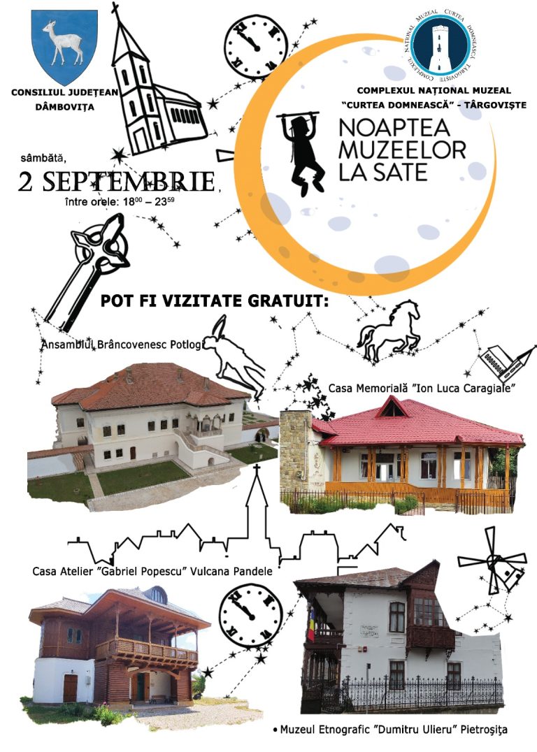 Aceasta este marcată cum se cuvine și în județul Dâmbovița, care se numără printre cele 36 de județe din țară și se mai primesc înscrieri chiar și în aceste zile înainte de eveniment. Consiliul Județean Dâmbovița, prin Complexul Național Muzeal „Curtea Domnească” Târgoviște, organizează sâmbătă, 2 septembrie 2023, evenimentul cultural „Noaptea Muzeelor la Sate”.Publicul poate să descopere expozițiile muzeelor într-un mod inedit, făcând o plimbare nocturnă printr-un patrimoniu cultural divers, situat în zona rurală a județului Dâmbovița.