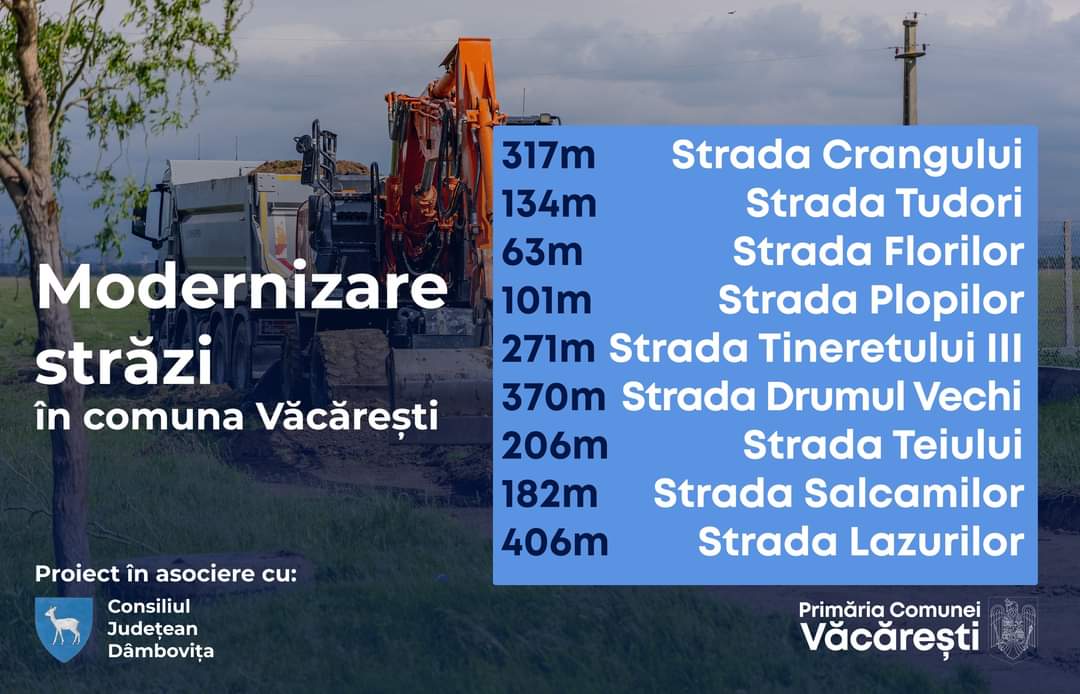 Proiectul se desfășoară în asociere cu Consiliului Județean Dâmbovița iar cele nouă străzi din comuna Văcărești, vor fi complet modernizate cu finanțare prin PJDL, adică asociere între Primăria Văcărești și CJ Dâmbovița.