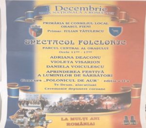 Oraşul Fieni începe să îmbrace haine de sărbătoare. Mai este doar o lună până la Crăciun, iar pregătirile sunt în toi.Data de 1 Decembrie este una dintre cele mai importante sărbători pentru întreaga Românie. Ca şi anul trecut, administraţia de la Fieni, condusă de primarul Iulian Tătulescu şi viceprimarul Gheorghe Secăreanu, a pregătit multe surprize de 1 Decembrie. La Fieni, manifestarile festive organizate cu acest prilej, sunt deosebite. Vor avea loc depuneri de coroane la cele trei monumente, slujba religioasă, ediţtia a II-a a Concursului culinar „Polonicul de aur”, ocazie cu care publicul participant la evenimentul din Parcul Central va degusta preparatele din fasole cu ciolan, expoziţie etnografică şi, nu în ultimul rând, un spectacol folcloric sustinut de artisti consacrati. „Fiii Enei – dulceţuri şi delicatese” va onora invitaţia cu un stand cu produse culinare tradiţionale româneşti. Pe 1 decembrie, în Parcul Central se va aprinde şi iluminatul festiv de Crăciun.