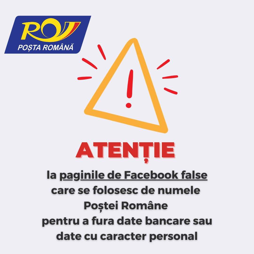 Atenție la paginile false care se folosesc de numele Poștei Române pentru a vă înșela! În ultima perioadă au apărut o mulțime de pagini și grupuri de Facebook care pretind că vând colete „uitate” – NU le oferiți date bancare sau cu caracter personal! Dacă întâlniți o astfel de pagină, raportați-o!