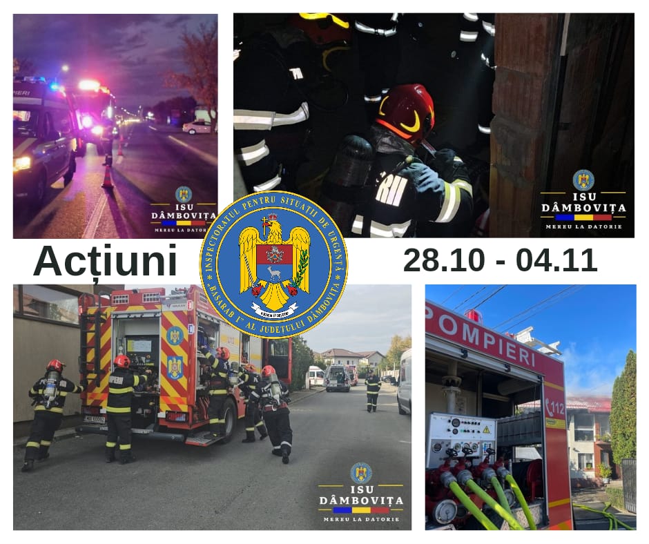 În perioada 28 octombrie – 4 noiembrie 2024, pompierii din cadrul Inspectoratului pentru Situații de Urgență „Basarab I” al județului Dâmbovița au intervenit la 234 de evenimente, demonstrând profesionalism și pregătire în fața situațiilor de urgență. Printre acestea s-au numărat 17 incendii, 16 intervenții la accidente rutiere și 29 de acțiuni pentru alte situații de urgență, inclusiv salvări de persoane și animale, deblocări de uși și asigurări de zonă.
