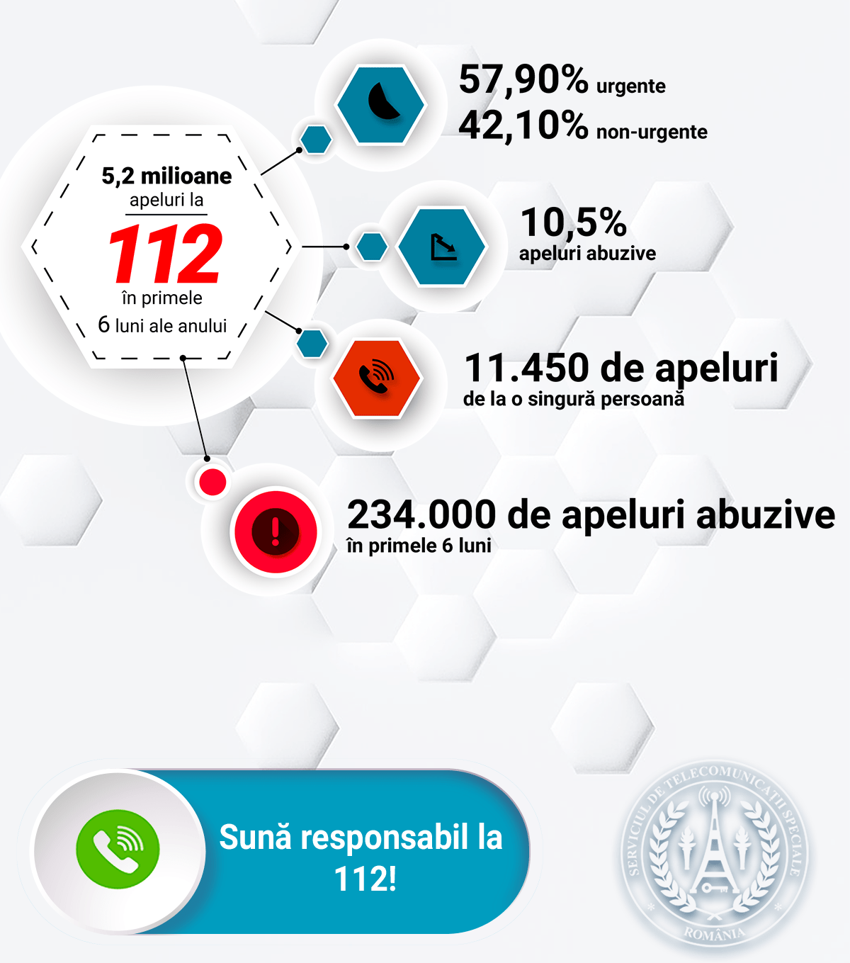 Dintre acestea, cele mai multe au fost preluate de operatorii 112 din județele Gorj, Argeș, Olt, Constanța și Dolj. O persoană din Argeș a sunat la 112 de 11.450 de ori, în primele șase luni. Aceste apeluri au fost efectuate de pe o cartelă prepay și reprezintă 6,92% din numărul total al apelurilor din județ. În continuare, adulții sunt cei care sună abuziv la 112, de zece ori mai mult decât copiii.