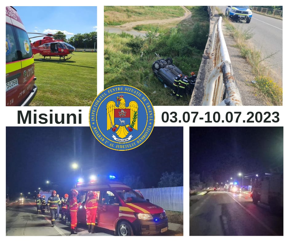 În perioada 03 iulie – 10 iulie 2023, echipajele de intervenție din cadrul Inspectoratului pentru Situații de Urgență „Basarab I” al județului Dâmbovița au acționat în cadrul a 333 de evenimente: 12 incendii (locuințe, anexe gospodărești, vegetație uscată etc.); 16 acțiuni în caz de accidente rutiere, 32 de acțiuni pentru înlăturarea efectelor negative ale inundațiilor, 23 de acțiuni în alte situații de urgență (acțiuni pentru asistența persoanelor aflate în dificultate, deblocări de uși, salvări de animale, asigurarea zonei etc.) și 248 de cazuri medicale.