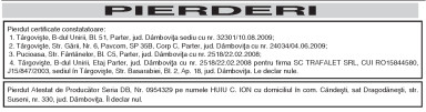 PIERDERI By: Ziarul Dambovita Date: 11/09/2018 FacebookTwitterPinterestWhatsApp PIERDERI TagsPIERDERI Articolul precedentPRIMĂRIA MUNICIPIULUI TÂRGOVIŞTE Str. Revoluţiei nr. 1-3, Târgovişte ANUNŢĂArticolul următorPsihologia politică şi apărarea socială (XXII) Ziarul Dambovita LĂSAȚI UN MESAJ Renunțați la răspuns Comentariu: Vă rugăm să introduceți comentariul dvs.! Nume:* Introduceți aici numele dvs. Email:* Ați introdus o adresă de e-mail incorectă! Vă rugăm să introduceți adresa dvs. de e-mail aici Website: Salvați numele meu, adresa de e-mail și site-ul web în acest browser pentru data viitoare i comentariu. Δ Acest site folosește Akismet pentru a reduce spamul. Află cum sunt procesate datele comentariilor tale. Popular Adrenalină și suspans la Cinema Independența din Târgoviște: „Anaconda” ajunge pe marele ecran A apărut Almanahul bisericesc 2026 al Arhiepiscopiei Târgoviștei – o oglindă a vieții pastorale și academice contemporane CJ Dâmbovița încheie o nouă ediție a programului de internship Avertisment pentru turiști: Recomandările jandarmilor montani înainte de urcarea în Bucegi Restricții de circulație în Ungaria, pe Drumul Principal 42 punct frontieră Artand-Borș, începând cu 1 ianuarie 2026! ȘtiriDâmbovița Județul Dâmbovița, sub asediul gerului – temperaturi de până la -11 grade Celsius Roxana - Ionela Botea - 02/01/2026 Dimineață geroasă – 2 ianuarie , temperaturi minime înregistrate... Vești bune pentru fermieri: începe depunerea cererilor pentru bunăstarea animalelor (DR-06) Roxana - Ionela Botea - 02/01/2026 Fermierii din sectorul zootehnic au motive de optimism la... Mani Gyenes, din nou la startul Raliului Dakar: România are reprezentant în cursa supremă a anduranței Roxana - Ionela Botea - 02/01/2026 România va fi din nou reprezentată la cel mai... Noi taxe și impozite în vigoare de la 1 ianuarie 2026 Roxana - Ionela Botea - 02/01/2026 Începând cu 1 ianuarie 2026, în România au intrat...