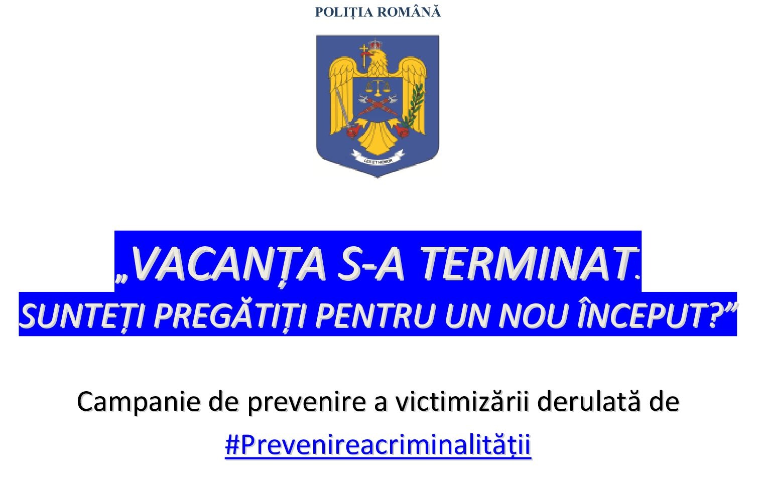 Peste patru zile, elevii vor reveni în bănci după vacanța de vară. În acest context, Poliţia Română, derulează, în perioada 29 august – 11 septembrie 2022, Campania de prevenire a victimizării minorilor sub sloganul „Vacanţa s-a terminat. Sunteţi pregătiţi pentru un nou început?”.