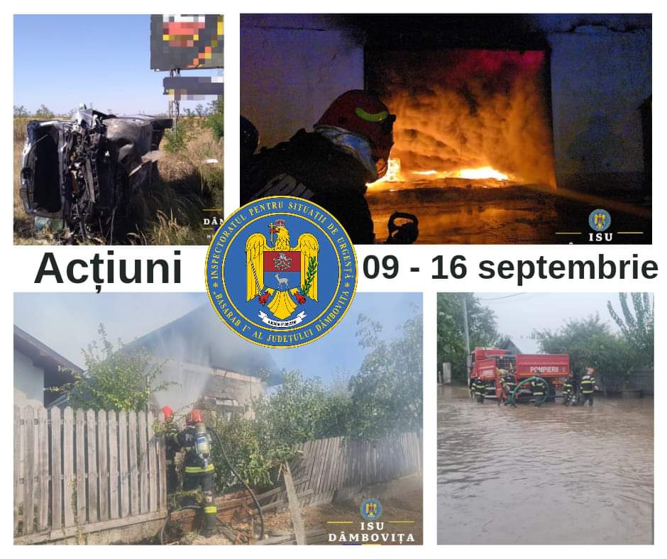 În perioada 09 – 16 septembrie 2024, echipajele de intervenţie din cadrul Inspectoratului pentru Situaţii de Urgenţă „Basarab I” al judeţului Dâmboviţa au acționat la 86 evenimente: 26 incendii (locuinţe, anexe gospodăreşti, vegetație uscată etc.),15 evenimente rutiere, 38 acţiuni la alte situaţii de urgenţă (deblocări de ușă, salvări animale, asigurare zonă etc.) 7 acțiuni pentru înlăturarea efectelor negative ale inundațiilor.