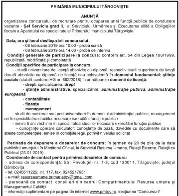PRIMĂRIA MUNICIPIULUI TÂRGOVIŞTE ANUNŢĂ By: Ziarul Dambovita Date: 04/01/2019 FacebookTwitterPinterestWhatsApp PRIMĂRIA MUNICIPIULUI TÂRGOVIŞTE ANUNŢĂ TagsPRIMĂRIA MUNICIPIULUI TÂRGOVIŞTE ANUNŢĂ Articolul precedentANUNŢArticolul următorPRIMĂRIA MUNICIPIULUI TÂRGOVIŞTE Str. Revoluţiei nr. 1-3, Târgovişte ANUNŢĂ Ziarul Dambovita LĂSAȚI UN MESAJ Renunțați la răspuns Comentariu: Vă rugăm să introduceți comentariul dvs.! Nume:* Introduceți aici numele dvs. Email:* Ați introdus o adresă de e-mail incorectă! Vă rugăm să introduceți adresa dvs. de e-mail aici Website: Salvați numele meu, adresa de e-mail și site-ul web în acest browser pentru data viitoare i comentariu. Δ Acest site folosește Akismet pentru a reduce spamul. Află cum sunt procesate datele comentariilor tale. Popular Adrenalină și suspans la Cinema Independența din Târgoviște: „Anaconda” ajunge pe marele ecran A apărut Almanahul bisericesc 2026 al Arhiepiscopiei Târgoviștei – o oglindă a vieții pastorale și academice contemporane CJ Dâmbovița încheie o nouă ediție a programului de internship Avertisment pentru turiști: Recomandările jandarmilor montani înainte de urcarea în Bucegi Restricții de circulație în Ungaria, pe Drumul Principal 42 punct frontieră Artand-Borș, începând cu 1 ianuarie 2026! ȘtiriDâmbovița Județul Dâmbovița, sub asediul gerului – temperaturi de până la -11 grade Celsius Roxana - Ionela Botea - 02/01/2026 Dimineață geroasă – 2 ianuarie , temperaturi minime înregistrate... Vești bune pentru fermieri: începe depunerea cererilor pentru bunăstarea animalelor (DR-06) Roxana - Ionela Botea - 02/01/2026 Fermierii din sectorul zootehnic au motive de optimism la... Mani Gyenes, din nou la startul Raliului Dakar: România are reprezentant în cursa supremă a anduranței Roxana - Ionela Botea - 02/01/2026 România va fi din nou reprezentată la cel mai... Noi taxe și impozite în vigoare de la 1 ianuarie 2026 Roxana - Ionela Botea - 02/01/2026 Începând cu 1 ianuarie 2026, în România au intrat...
