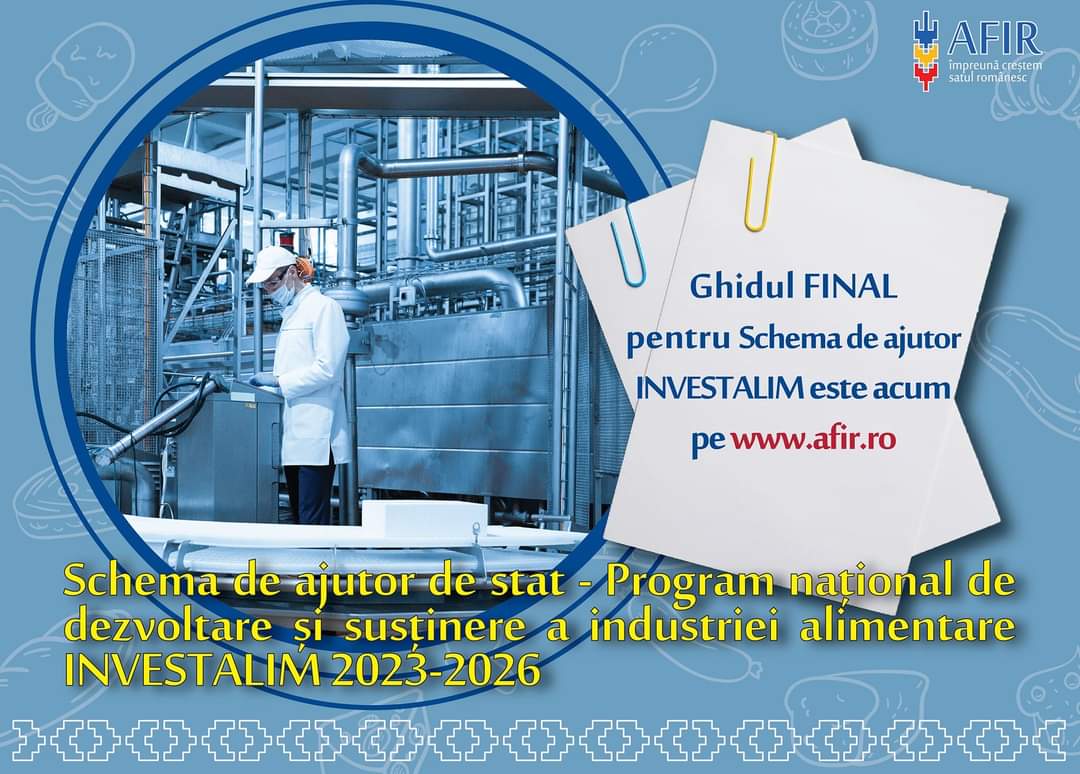 Ghidul solicitantului și anexele acestuia pentru accesarea fondurilor disponibile pentru procesatori prin Programul național de dezvoltare și susținere a industriei alimentare INVESTALIM sunt acum pe pagina oficială de internet, www.afir.ro, în secțiunea dedicată schemei de ajutor de stat.