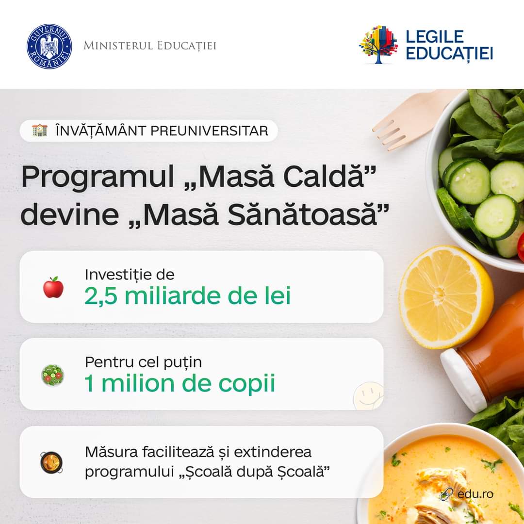 Asigurarea unui număr mai mare de beneficiari ai Programului Național „Masă Sănătoasă”, cu încadrarea în bugetul alocat – programul va cuprine preşcolarii şi elevii din minimum 1000 de unităţi de învăţământ preuniversitar de stat, față de maximum 1000, cât era prevăzut anterior.