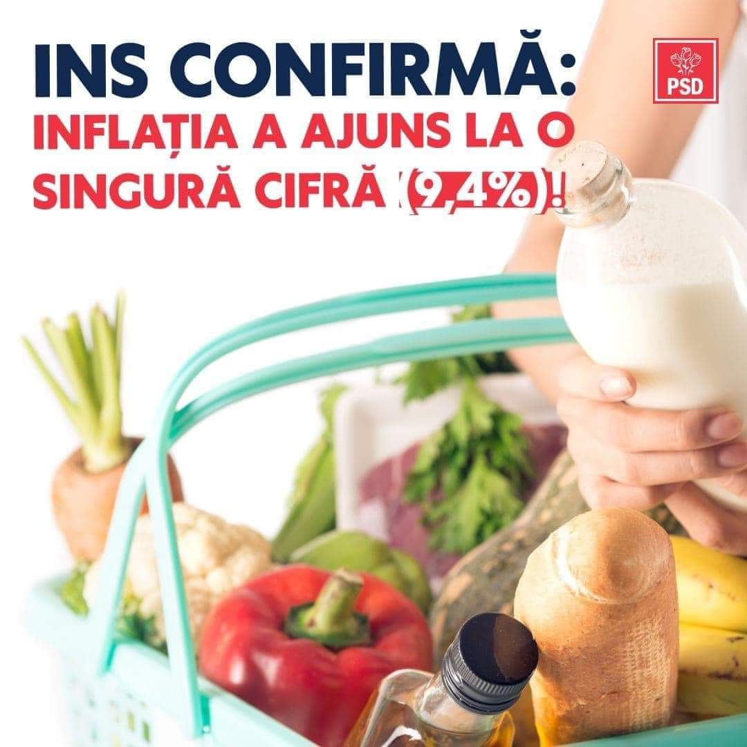 INS confirmă oficial că inflația a coborât la o singură cifră, 9,4%! După ce pandemia, liberalizarea ticăloasă a prețurilor la energie și gaze, criza energetică și războiul au împins inflația până la 16,8% în noiembrie anul trecut, iată că PSD spune că măsurile social-democrate de luptă contra inflației au avut succes.