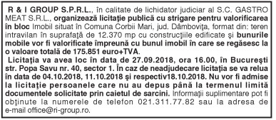 R & I GROUP S.P.R.L., în calitate de lichidator judiciar al S.C. GASTRO MEAT S.R.L., organizează licitaţie publică cu strigare pentru valorificarea în bloc Imobil situat în Comuna Corbii Mari, jud. Dâmboviţa