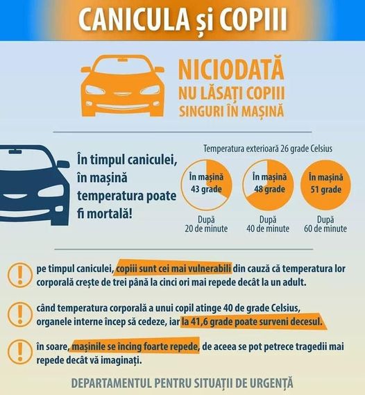 Nu lăsa niciodată copiii, bătrânii sau animalele singure în autovehicule închise! Cand temperatura unui copil ajunge la 40 de grade, organele interne incep sa cedeze, iar la o temperatura de 41,6 grade poate surveni decesul.