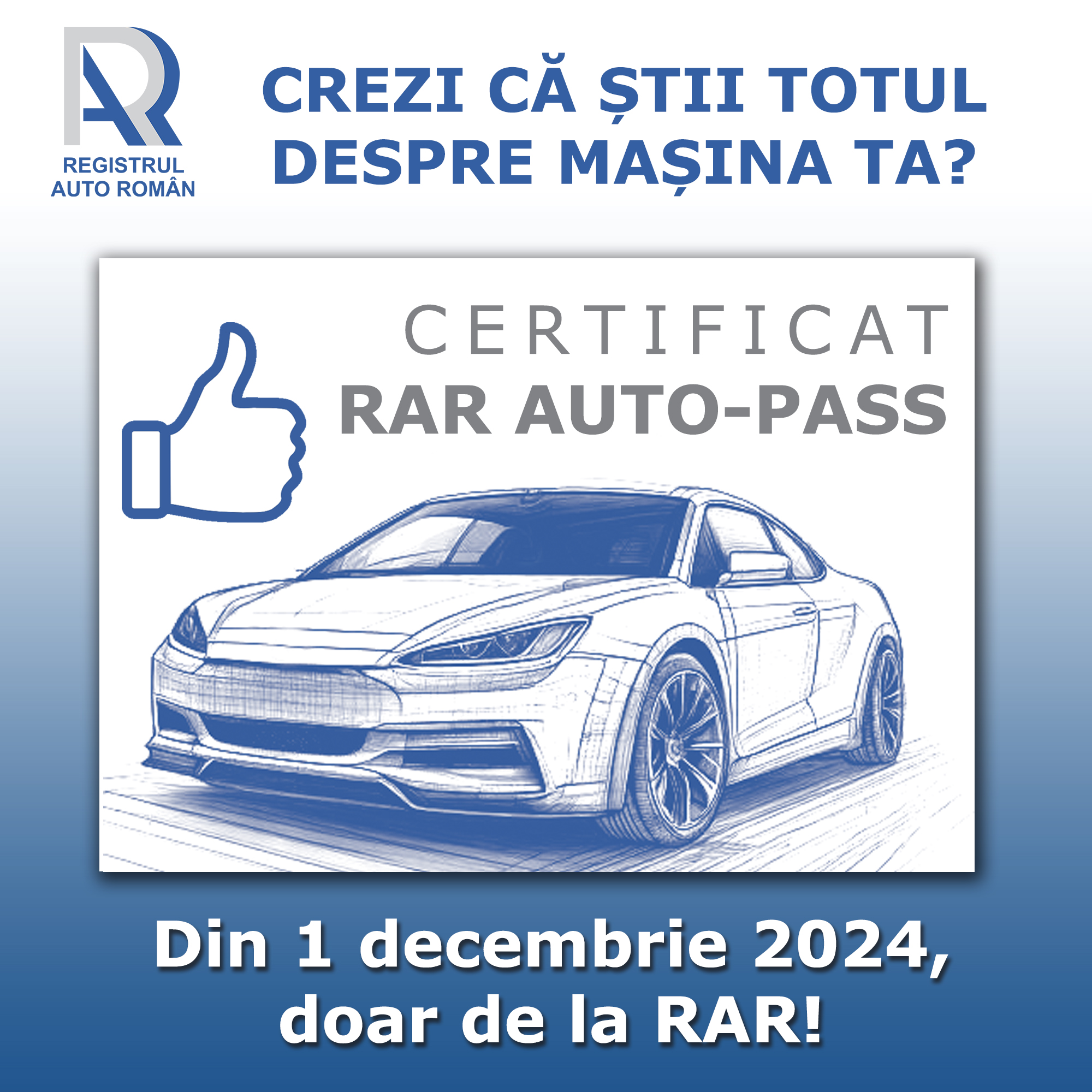 Începând din 1 decembrie, Registrul Auto Român (RAR) pune la dispoziție certificatul digital Auto-Pass, un document care poate fi solicitat exclusiv online, direct pe site-ul oficial www.rarom.ro. Acesta oferă cumpărătorilor informații esențiale despre istoricul unui autovehicul, fără a mai fi necesară prezentarea mașinii la RAR.